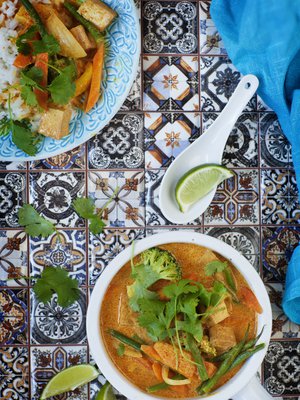 - Mittaa kattilaan kookosmaito ja vesi. Sekoita joukkoon vihreä currytahna ja kasvisliemikuutio. Lisää porkkanatikut, chilit ja siitakesienet. Kiehauta ja keitä hiljalleen poristen viisi minuuttia.