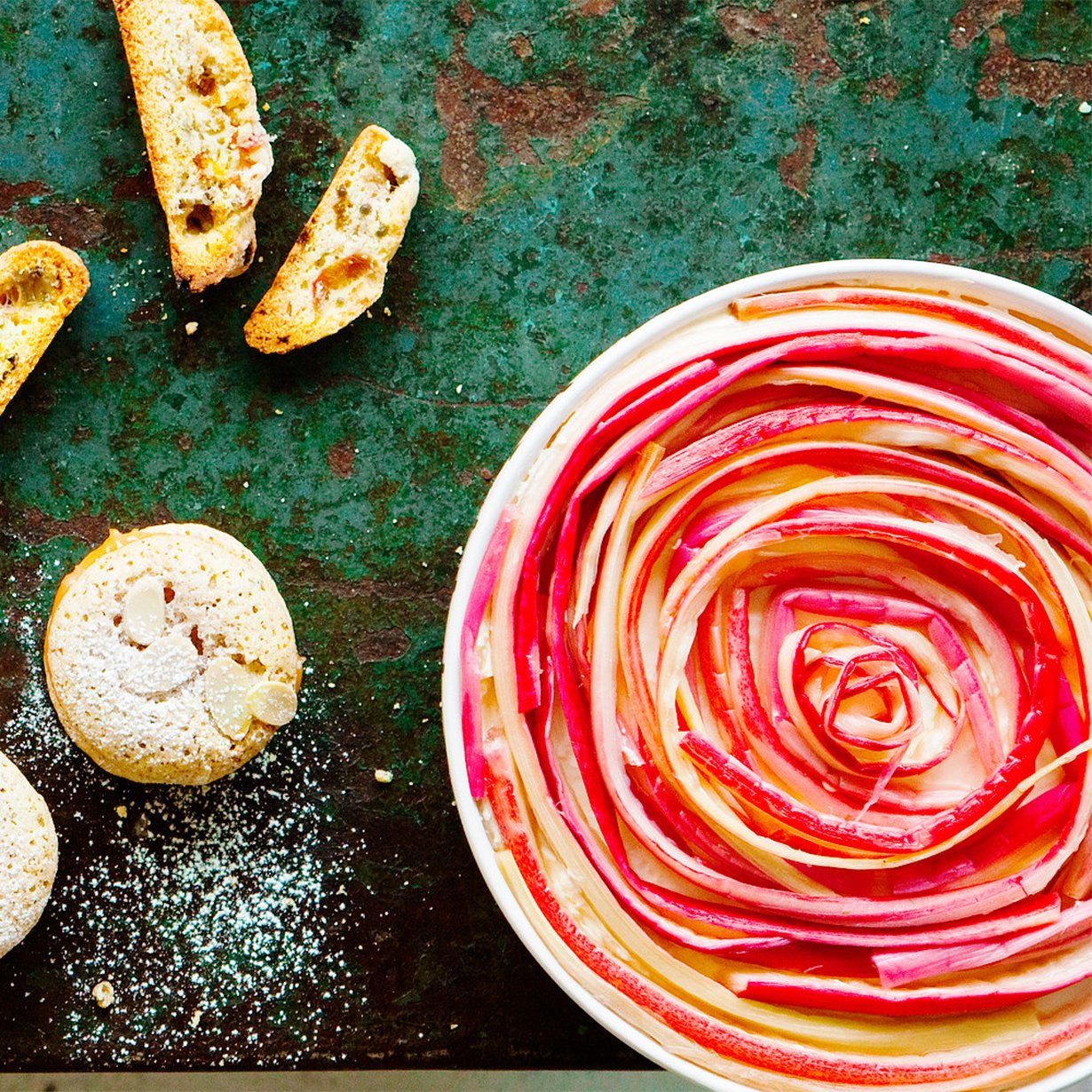 - Valuta ja kuivaa raparperisuikaleet. Asettele ne tiramisun päälle kierteiseen muotoon. Jäähdytä tiramisua jääkaapissa vähintään kolme tuntia tai yön yli.
