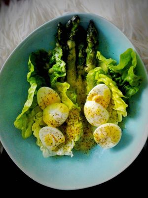 Suloinen kevätherkku: viiriäisenmunat sydänsalaattipesässä