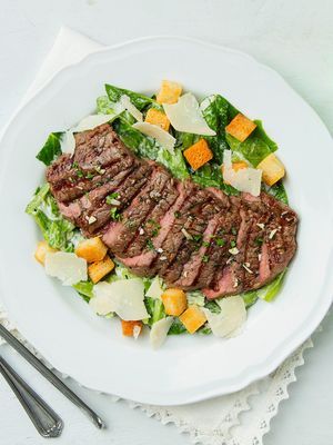 Inkivääri-valkosipulihunajalla glaseerattu pihvi ja caesarsalaatti