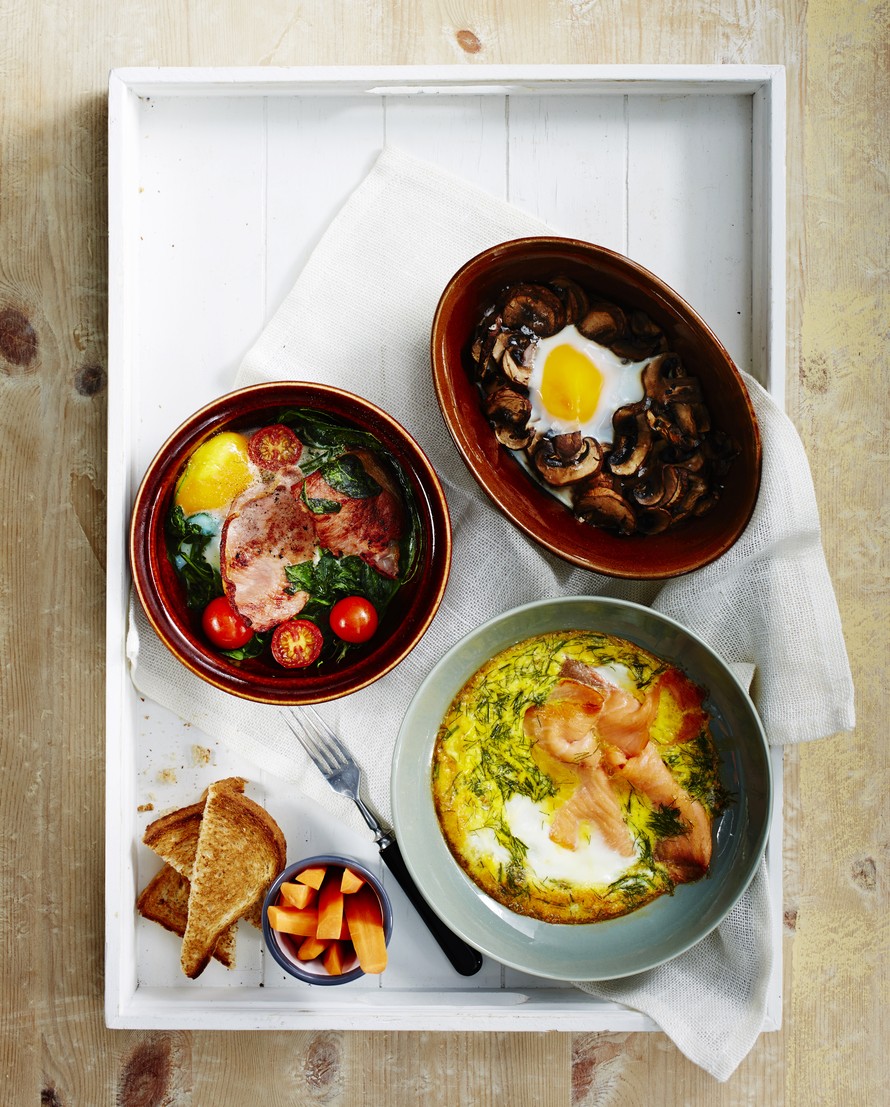 Kulhoon voi rakentaa oman munakkaan mielikuvituksen mukaan. Lisää kourallinen kasviksia, yrttejä, suolalihaa tai -kalaa ja riko päälle kananmuna. Aamiaisyllätys on kysennystä vaille valmis.