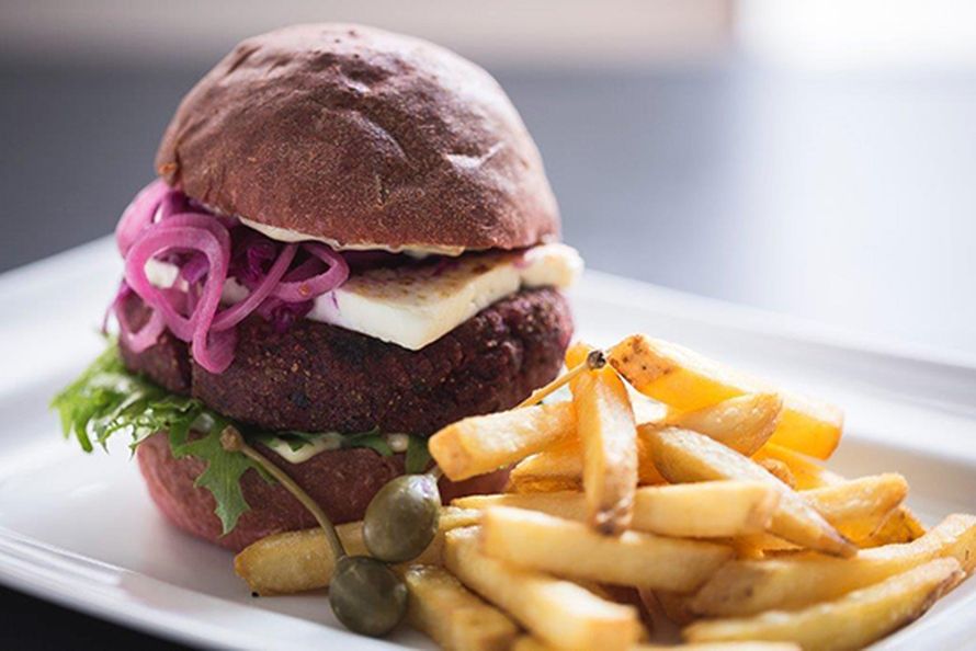 Tämä burgeri kätkee sisälleen herne-punajuuripihvin. Kuva: Ravintola Ilves