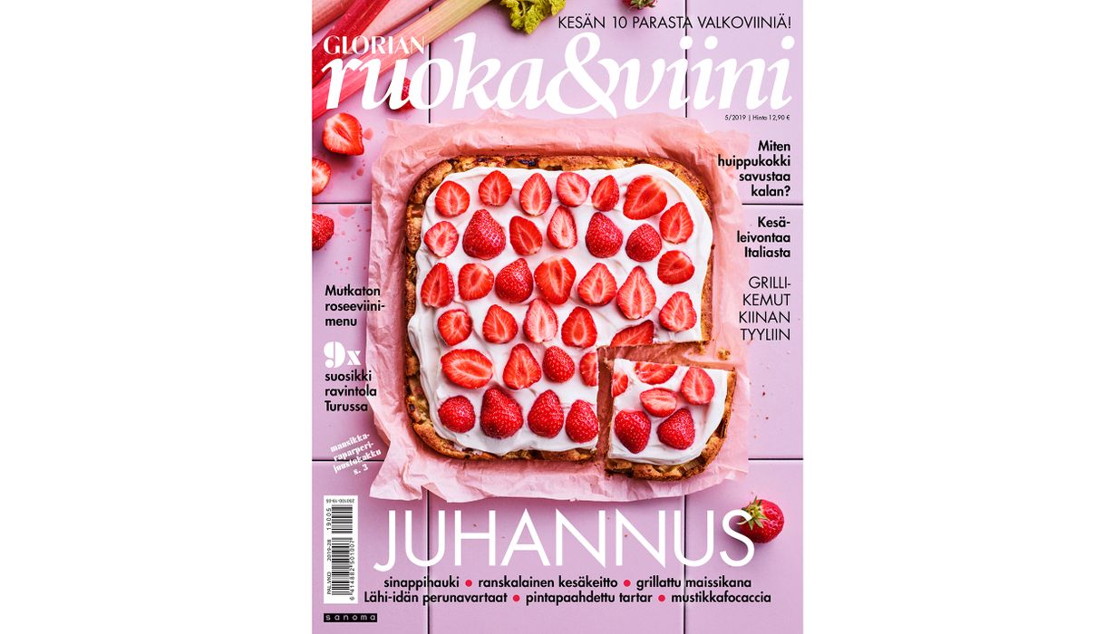 Jos pidät roseeviinistä, rakastut uusimman Glorian ruoka & viinin juhannusateriaan, jossa jokaiselle ruokalajille on etsitty pinkki viinipari. Mikäli etsit leivottavaa kesäiseen kahvihetkeen, ihastut mansikkaisen tahmakakun, suolaisenmakean mustikkafocaccian tai viimeistään kannessa olevan mansikka-raparperi-juustokakun reseptiin. Lehdessä tehdään myös kierros kotimaisissa paahtimo-kahviloissa, arvioidaan uusi Sikke’s ravintola ja kerrotaan ”sohvaperuna” Juhani Koskisen suosikkipaikat Turun upeasta ravintolatarjonnasta. Tuore lehti on myynnissä 6.6.