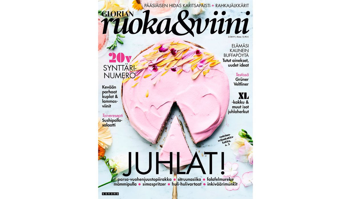 Glorian ruoka & viinin uusin numero juhlii kevättä ja 20-vuotista taivaltaan päräyttävillä resepteillä, osuvilla viiniyhdistelmillä ja kuumilla ravintolavinkeillä. Kauden nopeimmat reseptit tulevat japanilaisista kotikeittiöistä, ja upea pääsiäismenu tarjotaan valkoisten viinien kanssa. Huikean kauniiseen kevätbuffaan nostetaan havaijilaista uunilohta, sateenkaarisalaattia, huli-hulikanavartaita ja muita tropiikista makua hakeneita herkkuja. Maistoimme myös hittirypäleestä tehdyt itävaltalaisviinit ja poimimme niistä parhaat. Suuri juhlasuora on edessä, nautitaan siitä! Lehti on kaupoissa 4.4.