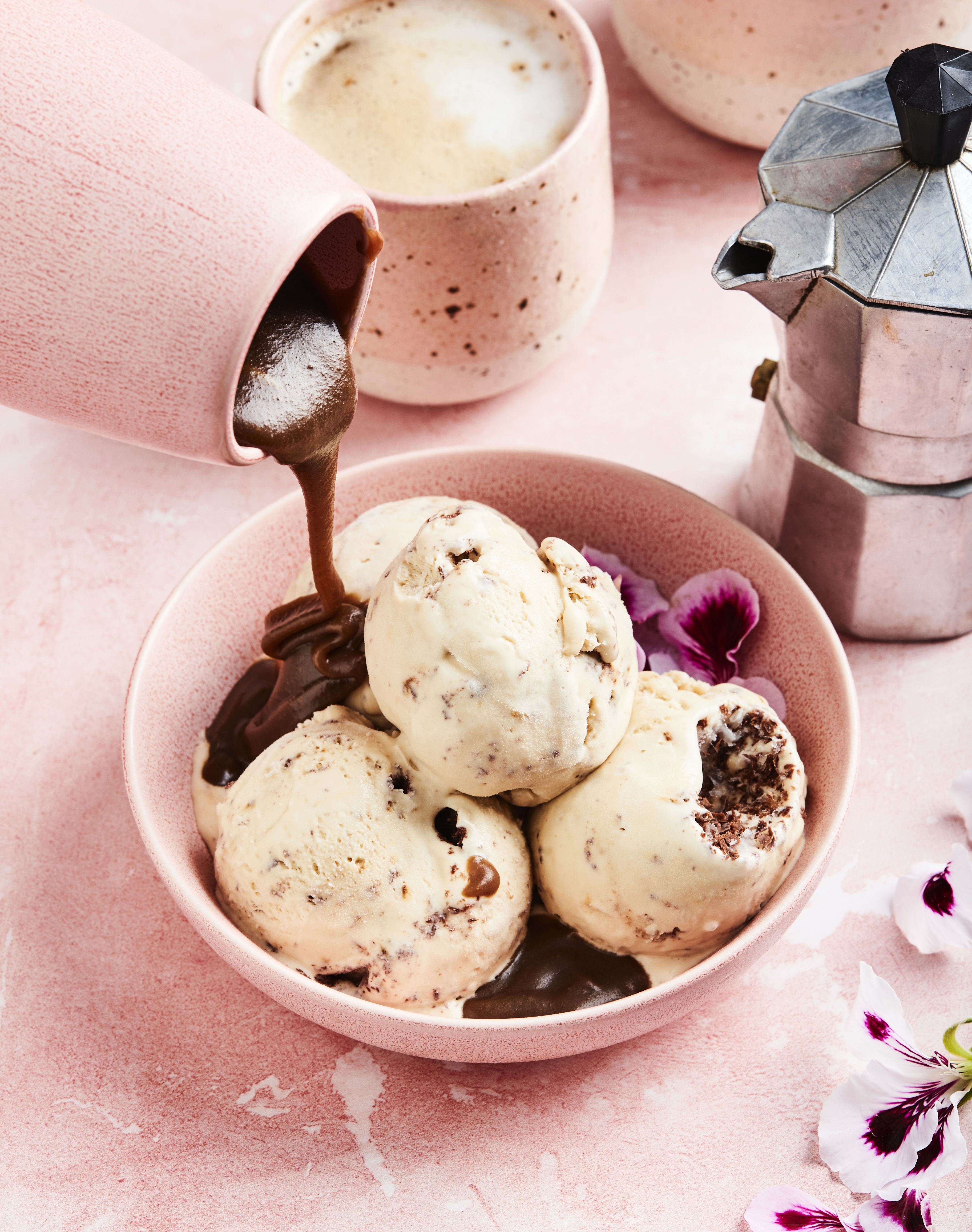 Jos jäätelön tekeminen itse kuulostaa aivan liian työläältä, niin osta kaupan valmista vaniljajäätelöä, mausta se hieman pehmenneenä pikakahvijauheella ja rouhitulla suklaalla. Keitä kylkeen ylijääneestä kahvista kinuski. Tarjoa marjojen tai vaikkapa kanelikeksien kanssa.