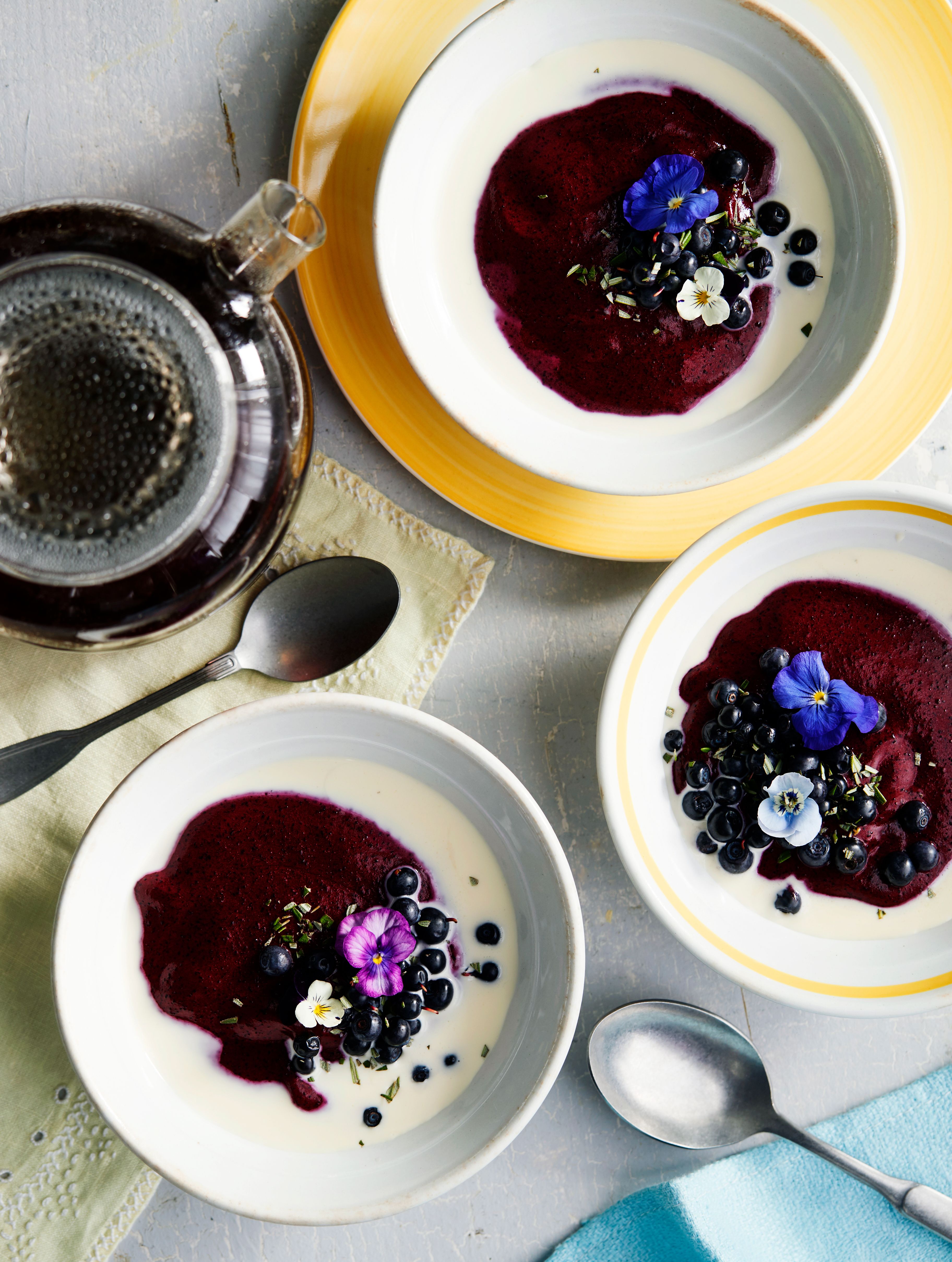 Mustikkamehusta syntyy upeanvärinen vispipuuro. Keitä marjoja ja sokeria kattilassa, kunnes marjat mehustuvat. Tämän jälkeen siivilöi mehu, lisää sen joukkoon hieman vettä ja keitä puuro mustikkaliemeen. Tarjoa valmiin vispipuuron kanssa rosmariinimaitoa, jonka metsäinen maku toimii hyvin mustikan kanssa.