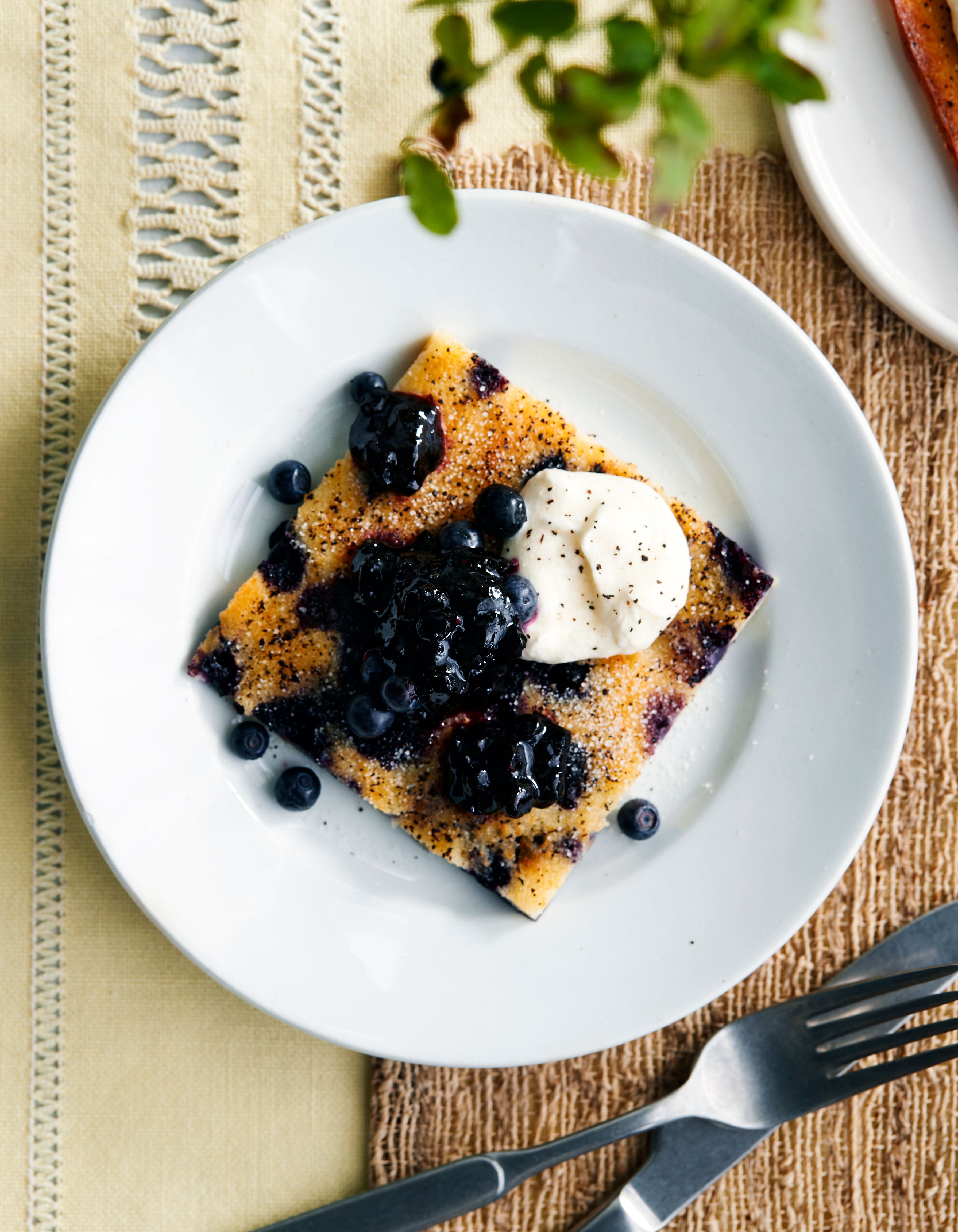 Tässä ohjeessa mustikat upotetaan ricotan kanssa pannukakkutaikinaan. Ennen kuin pannukakku laitetaan uuniin, sen päälle lusikoidaan voinokareita ja ripotellaan earl grey -teellä maustettua sokeria. Pannukakku maistuu ihanalta tuoreiden mustikoiden, mustikkahillon ja kermavaahdon kanssa.