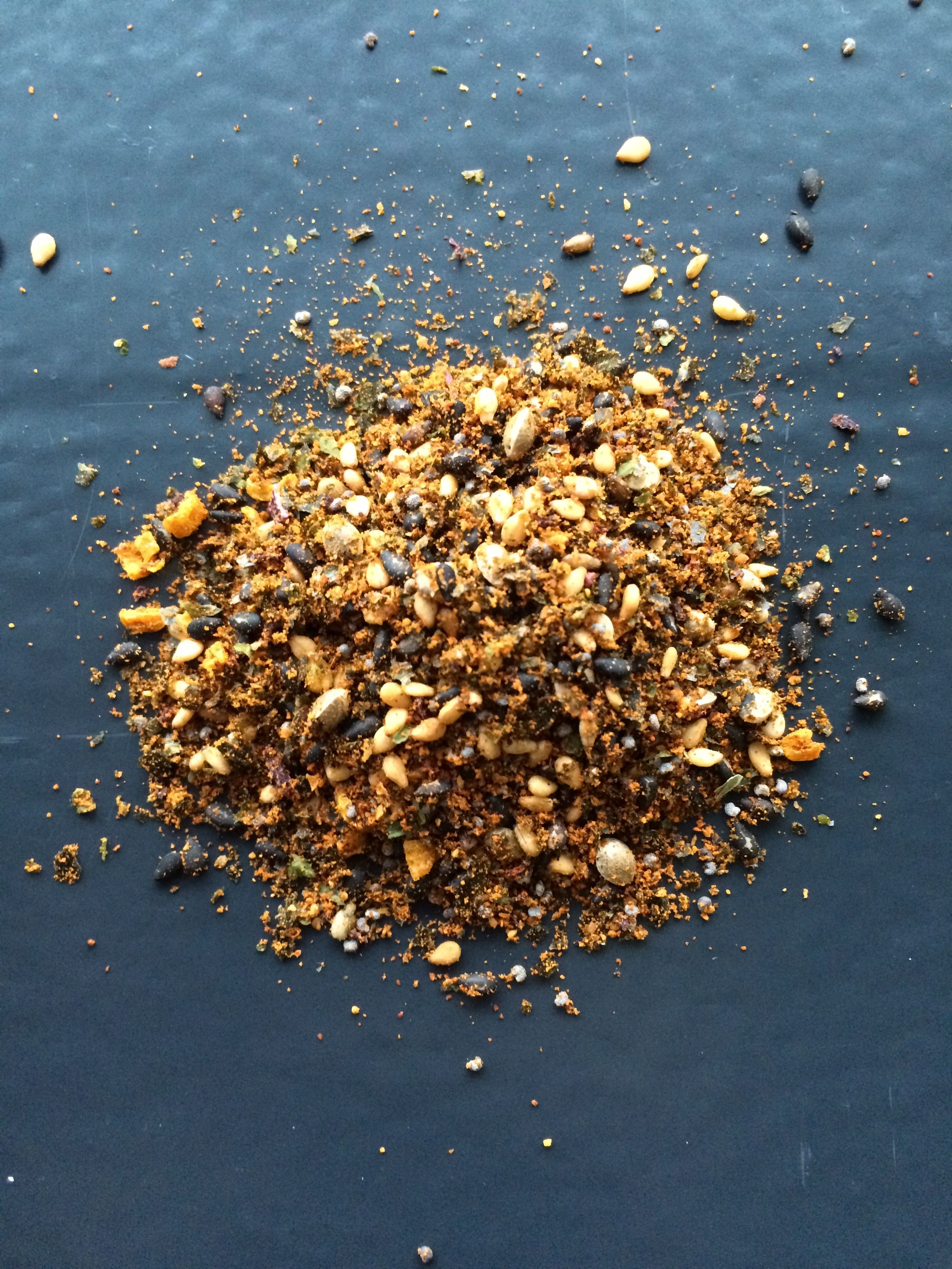 Appelsiinin, seesamin, chilin ja kuivatun merilevän yhdistelmä saa ajattelemaan myös munakkaita ja kalaa. Kannattaa kokeilla pinnalta paahdetun, sisältä raa’aksi jätetyn lohen ja uppomunan mausteena. Shichimi togarashin reseptin löydät täältä."