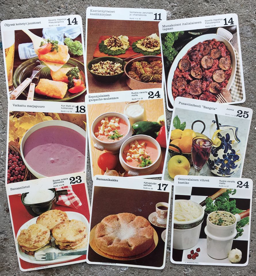 Banaaniletut, gazpacho, sangria, juustoranskalaiset. 1970-luvun reseptikorttien joukosta löytyy monta tuttua hittiohjetta.