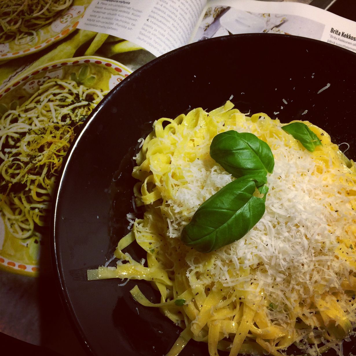 Alkuperäisessä reseptissä sitrusvoipasta tarjotaan ilman juustoa, mutta voin sanoa, ettei parmesaani ainakaan pilannut pastaa. Päinvastoin. Ruokaisuutta olisi voinut lisätä vaikkapa katkaravuilla, mutta taidan kokeilla niiden käyttämistä vasta ensi kerralla.
