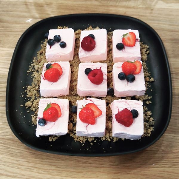 Suurempi joukko ruokittavana? Ei huolta! Etsi kaapeistasi suuri lautanen, mieluiten tumma ja neliönmuotoinen. Murustele keksit isoiksi muruiksi lautaselle, ja levitä murut tasaisesti joka puolelle. Leikkaa suorakaiteenmuotoisesta jäätelöpaketista paksuja siivuja poikittain, ja leikkaa sitten siivut vielä puoliksi. Asettele jäätelökuutiot lautaselle keksimurun päälle ja koristele marjoilla. Kun leikkaat jäätelön pakastekylmänä, se ehtii sulaa mukavan syömispehmeäksi annoksen kokoamisen aikana.