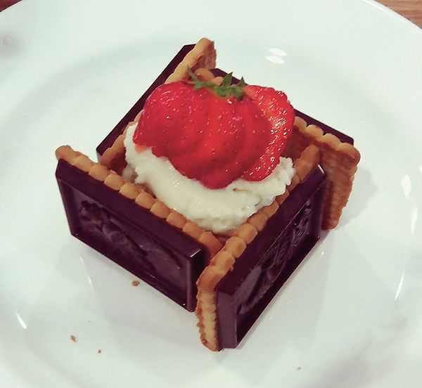 Neliönmuotoisista kekseistä saat hienon laatikkomaisen keksipesän jäätelölle. Pyöräytä jäätelöstä pallo ja pane se lautaselle. Asettele neliökeksit pallon ympärille laatikon muotoon. Koristele marjoilla, esimerkiksi viipaloidulla mansikalla.