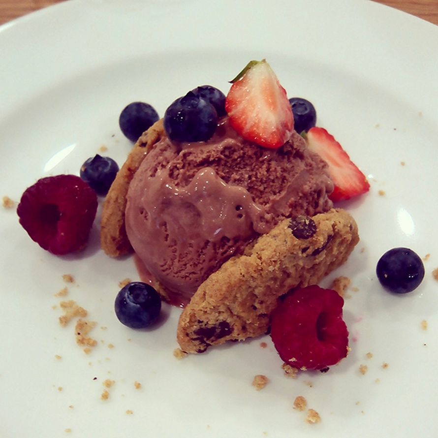 Tämän annoksen jujuna on ripotella marjoja ja keksinmuruja jäätelöpallon ympärille. (Näin niissä hienoissakin ravintoloissa tehdään, älkää kertoko kenellekään!). Pyöräytä jäätelöstä pallo. Leikkaa pyöreä keksi puoliksi. Aseta pallo lautaselle, ja purista keksinpuolikkaat sen ympärille. Ripottele keksinpuolituksesta jääneet muruset jätskin ympärille. Viimeistele marjoilla.