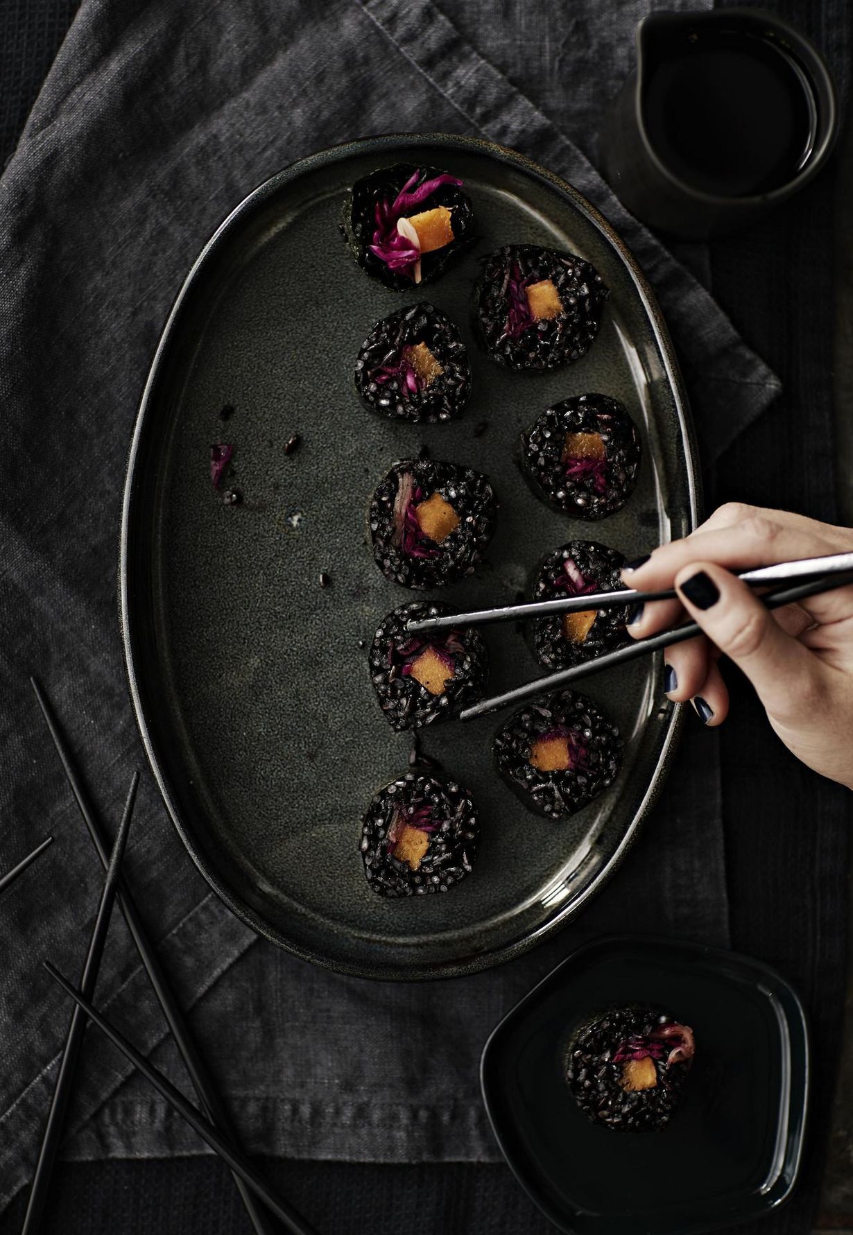Sushia joulupöydässä? Todellakin. Vegaanisten makirullien sisälle sujautetaan paahdettua kurpitsaa, pikapikkelöityä ja rapsakkaa punakaalia ja sushi-inkivääriä. Se tekee rullista erityisen näyttäviä, että ne tehdään tavallisen sushiriisin sijaan mustasta riisistä.