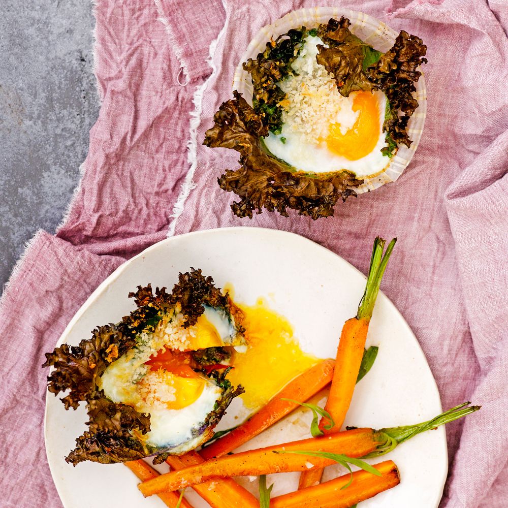 Alkuruoaksi vegepöytään sopivat kananmunat kaalikupeissa. Riko kananmunat lehtikaalikuppeihin tomaattiviipaleiden ja korppujauholla rapeutetun parmesaaniraasteen päälle ja kypsennä uunissa. Tee lisukkeeksi hunajaporkkanoita. Vinkki: Tämä on näyttävä tapa tarjota kananmunat vaikkapa brunssilla myös halloweenin jälkeen!