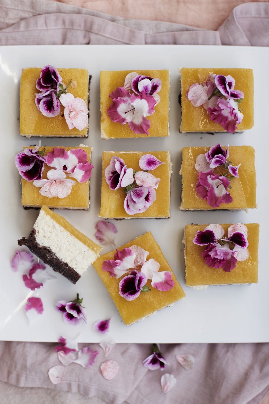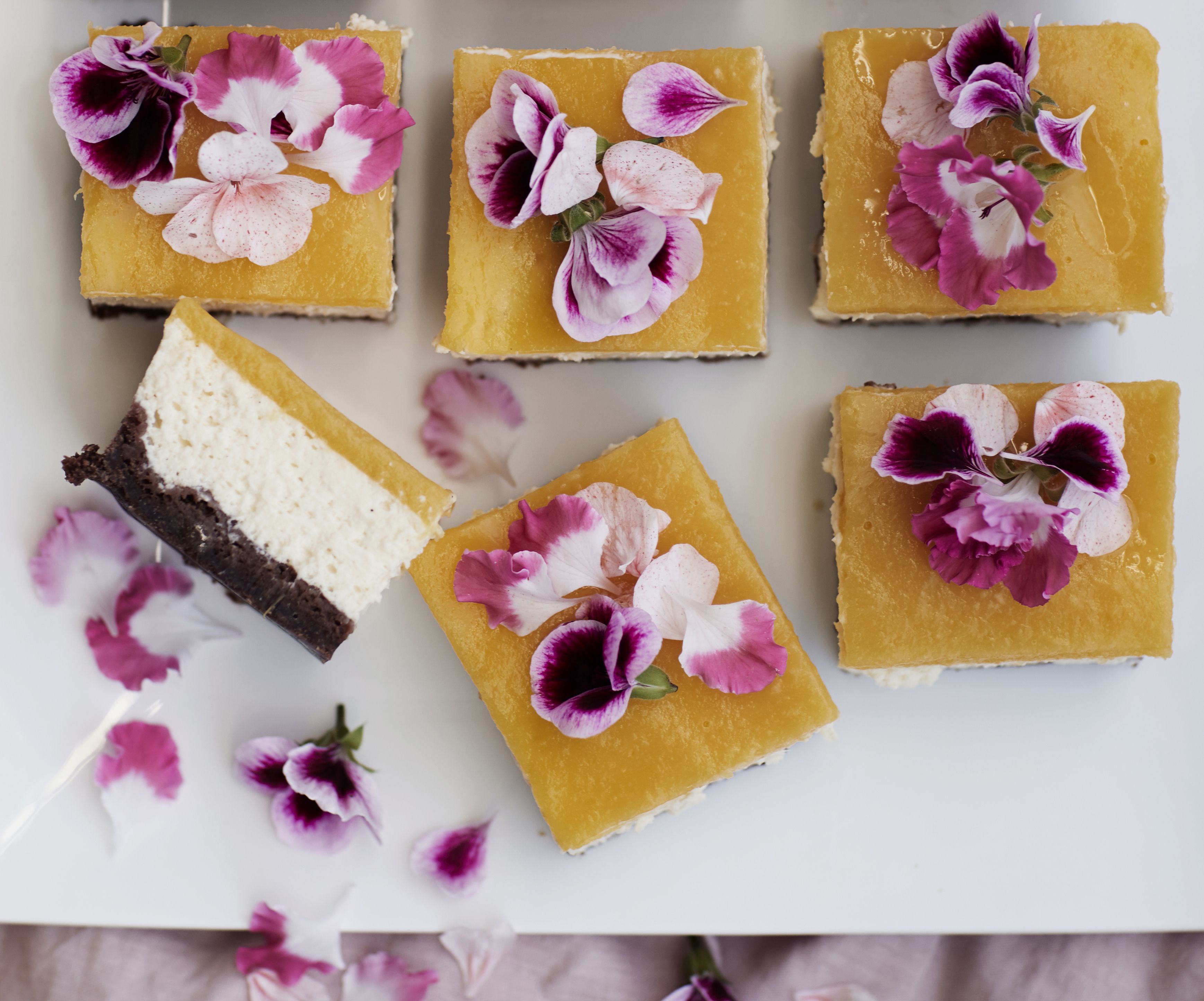- XL mangojuustokakku (kuvassa) on varma valinta juhlatarjoiluksi. Klassikkotäyte kohtaa tässä kakussa pellillä paistettavan pehmeähkön suklaapohjan. Leikkaa kakku valmiiksi annospaloiksi ja koristele palat syötävillä kukilla.