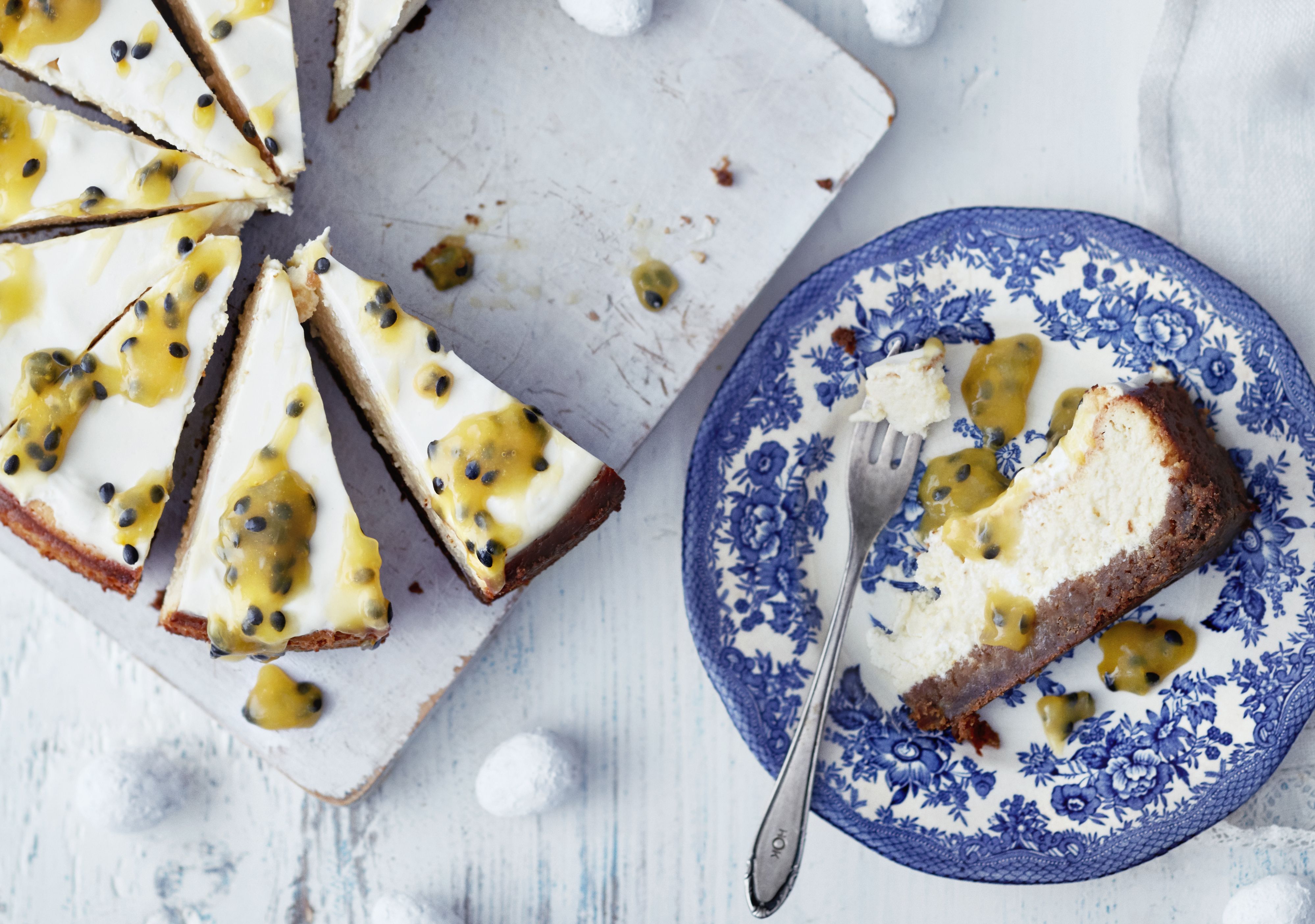 - Passionhedelmä-jogurttijuustokakku (kuvassa) saa raikkautensa sitruunankuorella maustetusta turkkilaisesta jogurtista. Kakku koristellaan upeilla passionhedelmillä, jotka ovat kypsiä silloin kun niiden kuori on kunnolla ryppyinen.