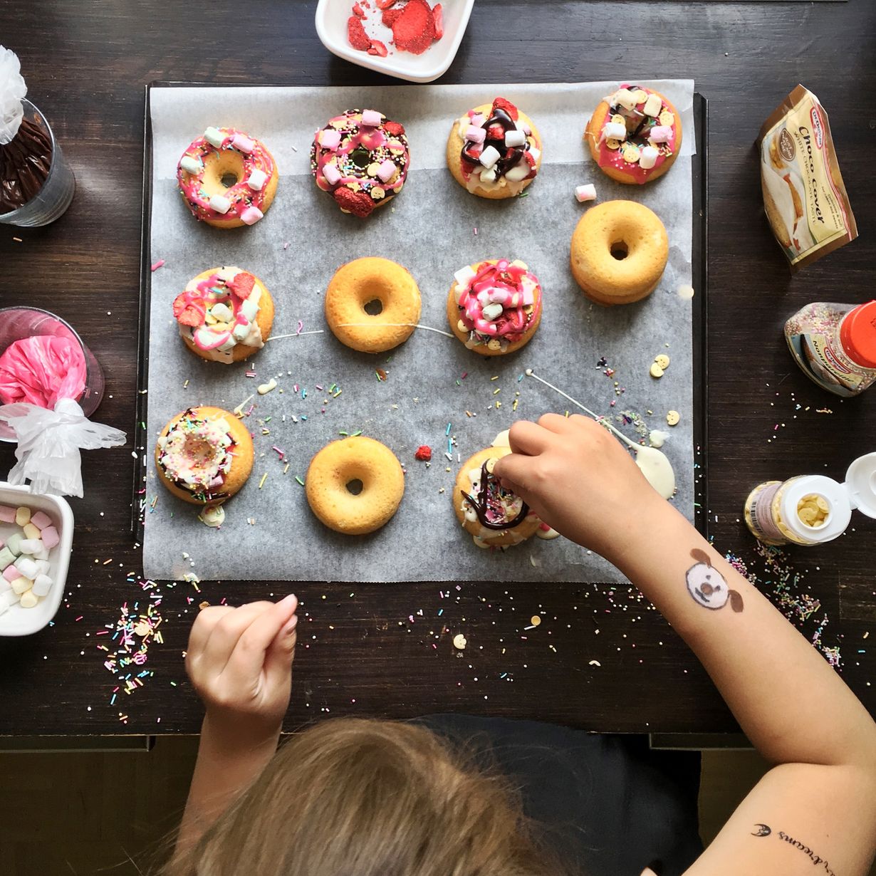 Varaa juhliin jotain hauskaa syötävää tekemistä, jonka ääressä lapset voivat puuhailla. Jos sankari toivoo juhliinsa leipomista, sellaiseksi sopii valmiiksi leivottujen herkkujen koristelu. Tee itse maailman helpoimmat donitsit tai kasa muffineja. Jos et ehdi leipoa, osta kaupan muhkeimmat muffinit. Varaa erilaisia kuorrutteita, sulatettua suklaata, nonparelleja ja pieniä karkkeja. Tällainen koristeluhetki voi olla synttäreiden rauhallisin osio. Herkut voi joko syödä juhlissa tai pakata mukaan, kun kuorrutukset ovat kovettuneet. Syötävä taideteos ilahduttaa vielä kotonakin.