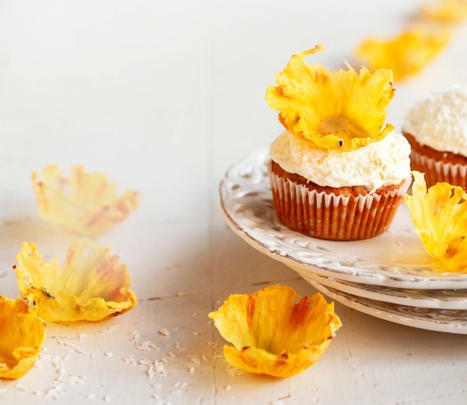 Herkullisimmat kuppikakut maistuvat ananakselta, inkivääriltä ja kookokselta. Saat kuppikakuista ihanan keväisiä, kun koristelet ne tuorejuustokuorrutuksella ja herkillä ananaskukilla. Ananaskukat kannattaa valmistaa jo edellisenä päivänä. Leikkaa kokonaisesta ananaksesta ohuita viipaleita ja kuivata uunissa noin tunnin ajan. Anna kuivua yön yli jääkaapissa tyhjän munakennon kupeissa. Lopputuloksena saat maukkaat ja kauniit ananaskukat!