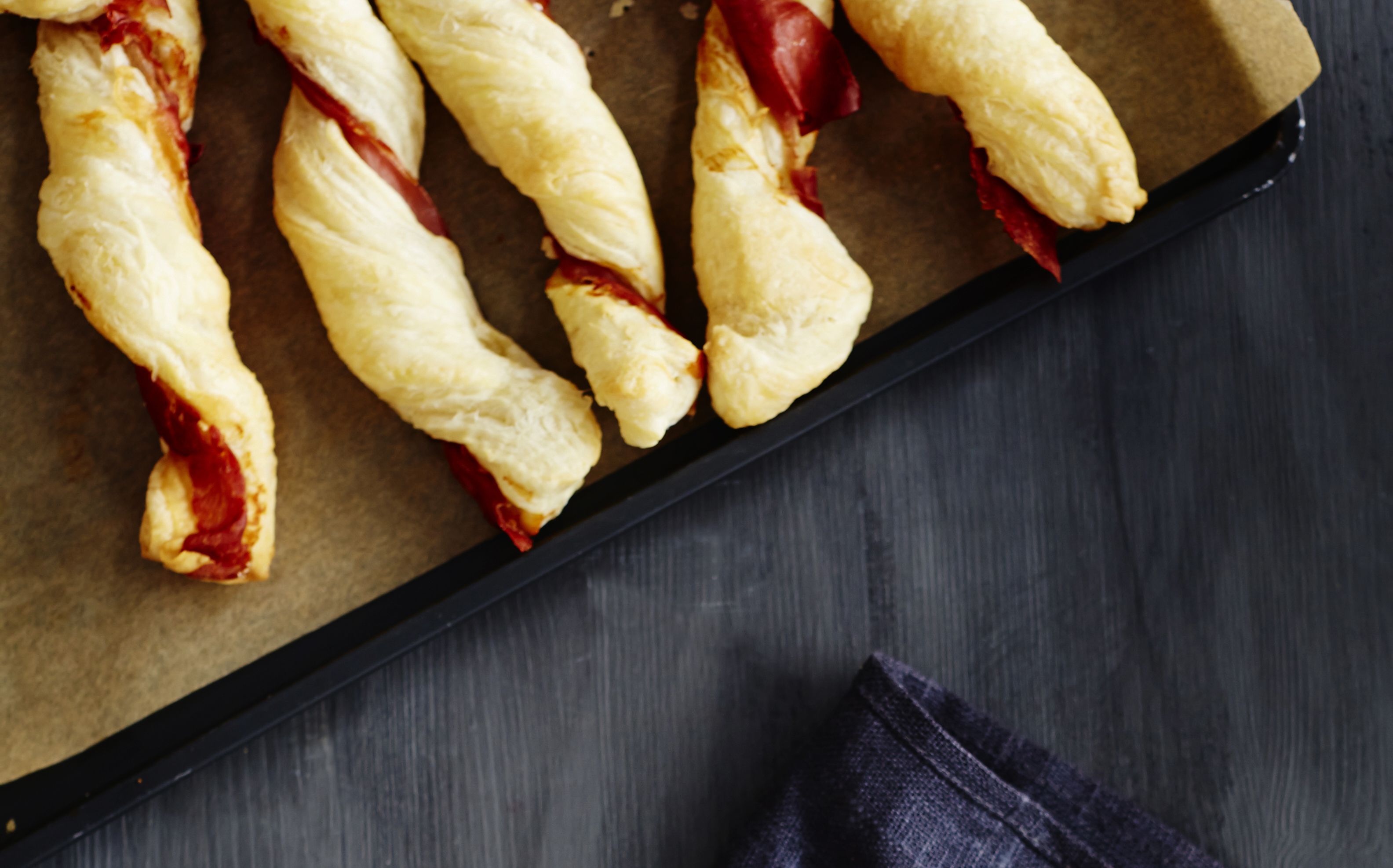 Valmistaikinasta ja ilmakuivatustakinkusta kääräistyt kinkkukierretikkuset ovat ikään kuin itseleivottuja, vaikka vievät tekijältään vain muutaman minuutin aktiivista aikaa. Näitä kannattaa tehdä tuplasatsi, sillä kinkkukierteet koukuttavat. Resepti löytyy täältä!