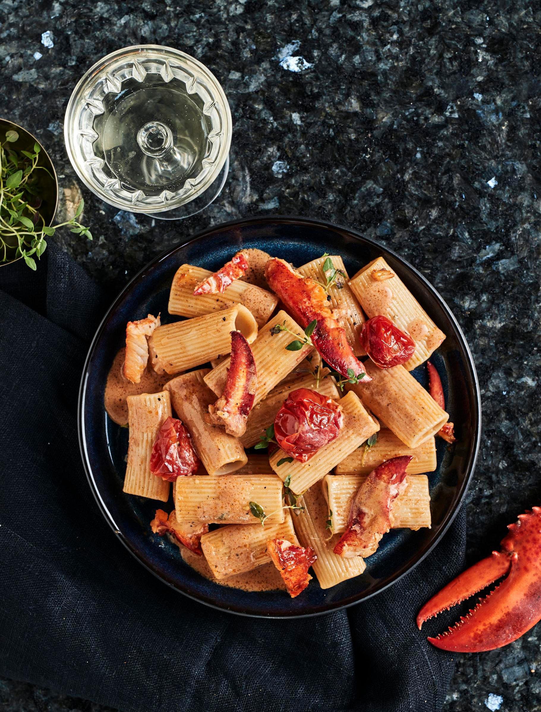 Hummerin saksi- ja pyrstölihat yhdistetään pastaan vasta aivan lopuksi. Niiden ohella pastan sattumiksi lisätään uunissa meheviksi paahdettuja kirsikkatomaatteja.
