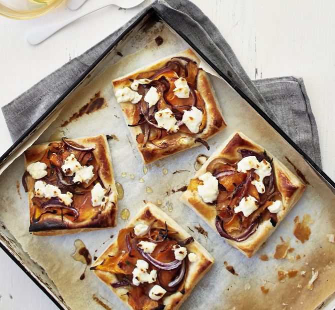 Makean bataatin ja hapokkaan vuohenjuuston jännittävä liitto sopii ruokahalun herättäjäksi. Kun puolitat lehtitaikinalevyt, saat jokaiselle kaksi omaa piiraspalaa, jotka voi syödä vaikka sormin.
