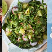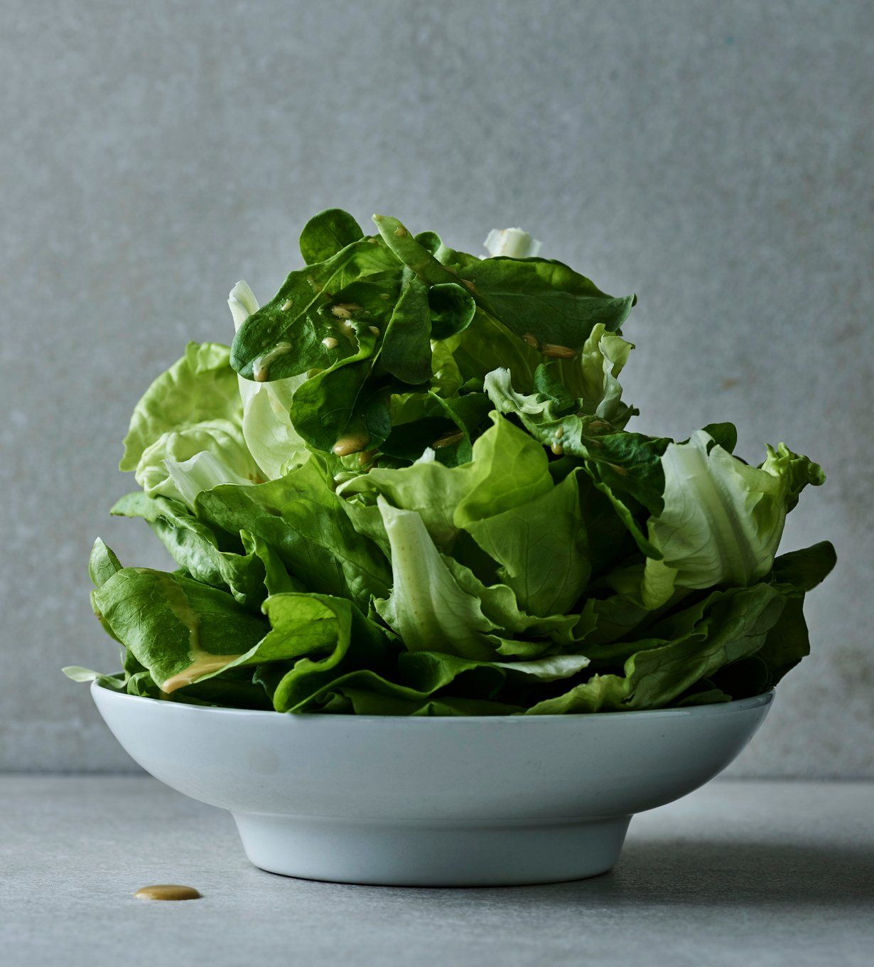 Voit sekoittaa kastikkeen valmiiksi jo hyvissä ajoin ennen salaatin kasaamista. Ja salaatti, se tosiaan kasataan: raikkaiksi huuhdotut ja kuivatut salaatinlehdet kootaan keoksi vadille ja väliin valutetaan salaatinkastiketta. Tässä seurassa pääsevät oikeuksiinsa kaikki kasvimaan eriparilehdet. Täydellinen juhannussalaatti siis!