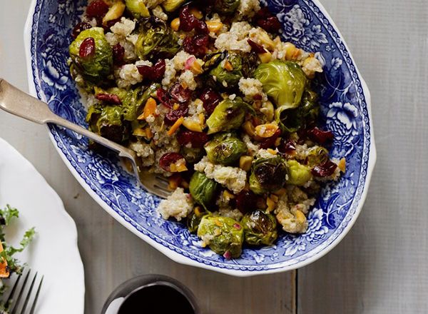 Kylmät salaatit ovat valmistujaisten buffetpöydät ykkösjuttu. Kvinoa tekee tästä salaatista ruokaisan, ja karpalot ja ruusukaalit sopivat yhteen hapokkaanmakean kastikkeen kanssa kuin kuplat shampanjaan. Suolapähkinät ovat salaatin rouskuva tekijä.