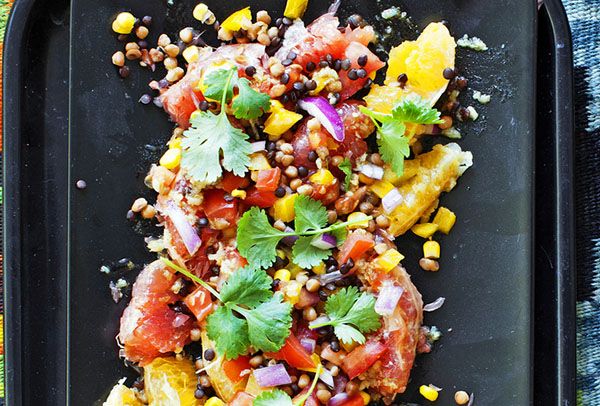 Tässäpä salaatti, joka tuo aivan uusia makuja salaattirepertuaariisi. Raikas kevätsalaatti pursuaa makuja: on sitrusta, sipulia, jeeraa, korianteria. Linssit takaavat salaatin ruokaisuuden. Maissi tuo salaattiin mukavaa hentoa makeutta tasapainottamaan muita makuja. Juhlapöydän värikkäintä antia maultaan sekä ulkonäöltään!