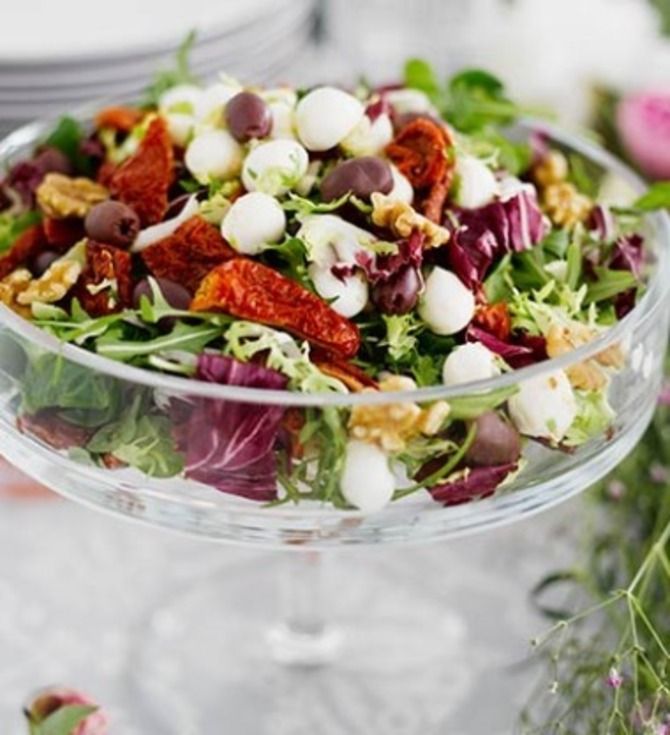 Raikas ja keväinen saalaatti, joka maistuu kaikille. Tarjoa balsamicosiirappi erikseen, niin salaatti pysyy tarjoilukunnossa pidempään.