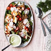 - Ruokaisa salaatti. Pastasalaatti on tuttu ruoka vappubrunssilla. Ruokaisa salaatti onnistuu kuitenkin pastan sijaan myös jyväsekoituksesta. Kun mukaan lisätään halloumia, rapeita retiisejä ja täyteläistä tilli-tahinikastiketta, kukaan ei jää kaipaamaan kylmää pastaa.