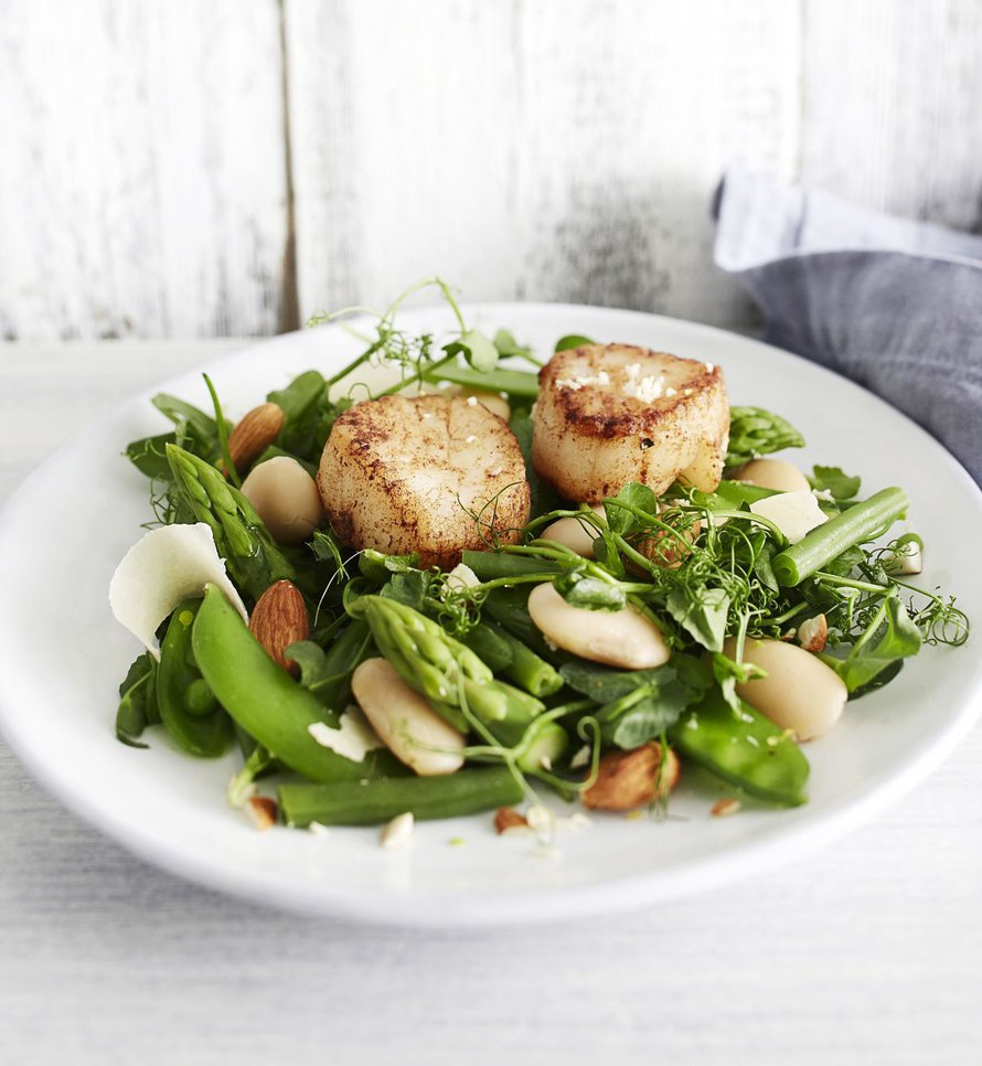 Paistetut kampasimpukat parsa-papusalaattipedillä – vahva aloitus pääsiäisaterialle. Tämä alkuruoka vie kielen mennessään. Parsakaudesta kannattaa ottaa kaikki ilo irti valmistamalla tätä herkkua.