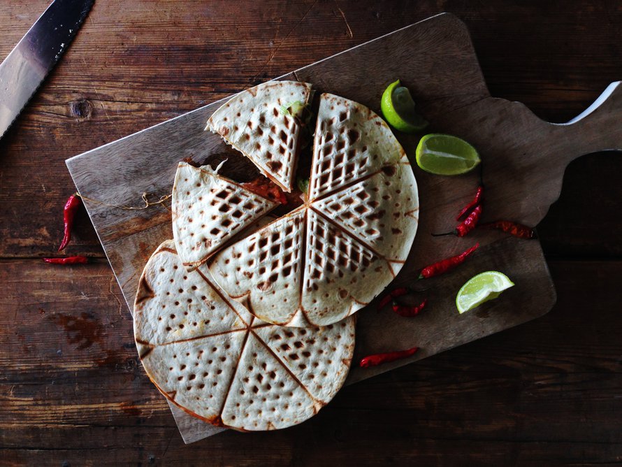 Vohvelinraudan välissä quesadillat paistuvat hyvin molemmilta puolilta. Täytä tortillat juustolla, chilikastikkeella ja tomaatilla. Viskaa mukaan myös yrttejä tai kevätsipulin varsia silputtuna. Älä täytä liiaksi vaan ole maltillinen, etteivät täytteet valu vohveliraudalle.