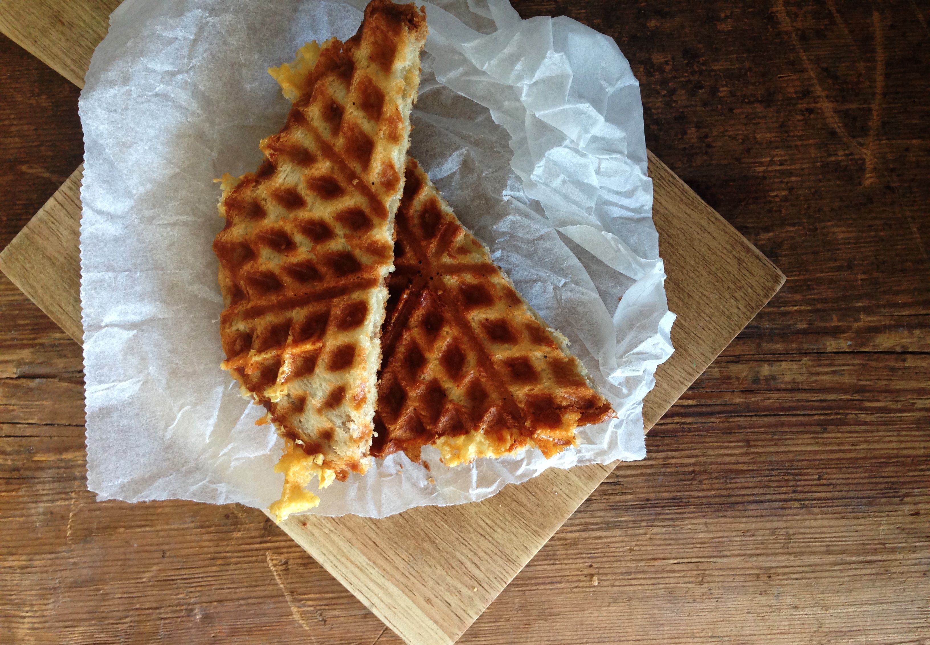 Sipaise kahdelle paahtoleivälle voita. Käännä voipuolet alaspäin ja täytä leipä esimerkiksi juustolla ja kinkulla. Nosta toinen siivu kasan päälle voipuoli ylöspäin. Grillaa koko komeus vohveliraudan välissä.