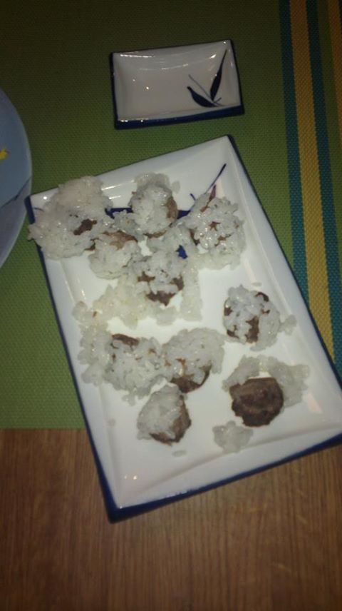 "Tässä haettiin ohjeen mukaan riisistä tehdyn pitsihunnun sisään pyöräytettyjä japanilaisia lihapullia. Eikö sitä näe heti kuvasta? Erityisesti pitsihuntua?"