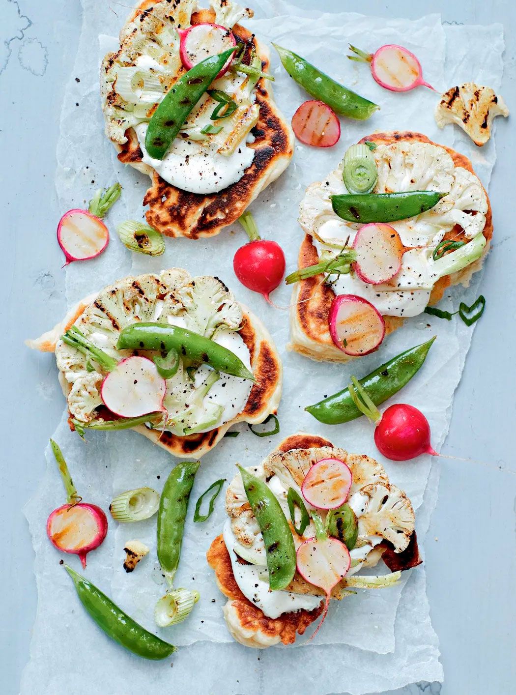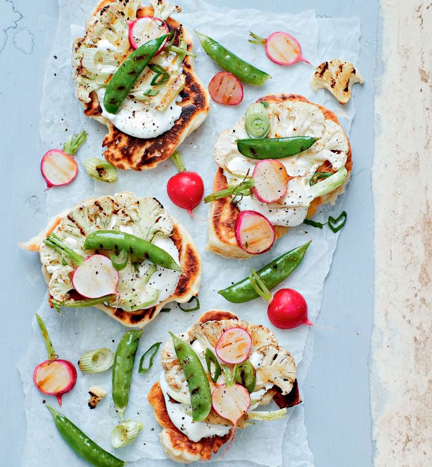 Jos rakastat kesäkeittoa, ihastut näihin pikapiiraisiin joiden päällä on kukkakaalia, herneitä ja kesäsipulia.