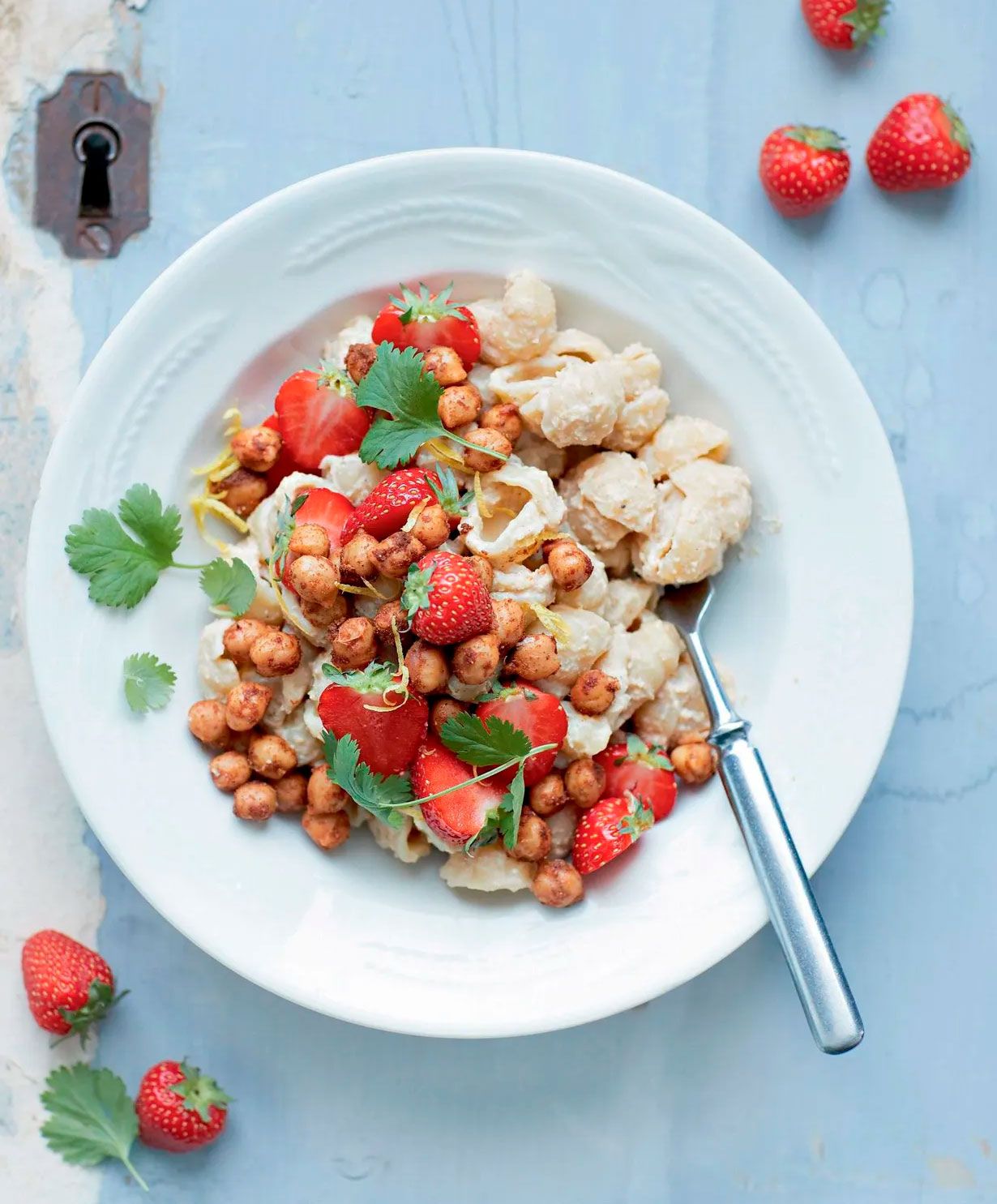 Juhlista mansikka-aikaa pyöräyttämällä mansikoista kesäinen pasta. Pehmeä hummus tekee siitä herkullisen kermaisen ja pasta sopii vegaaneillekin.