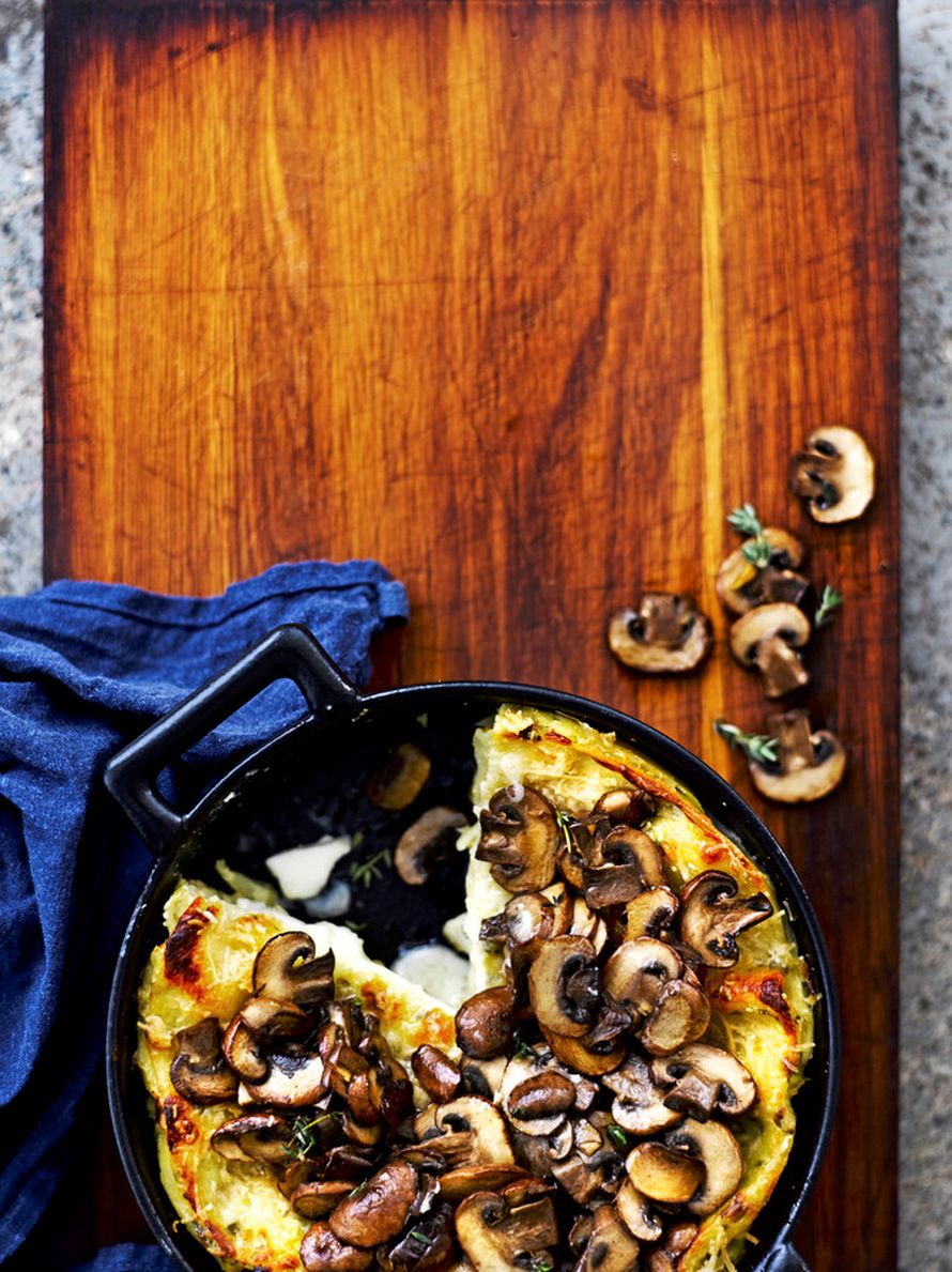 Ehkä hauskinta valkoisessa lasagnessa on kuitenkin se, ettei sitä päällystetä tuttuun tapaan juustolla, vaan valmiin lasagnen pinnalle ripotellaan timjamin kanssa paistettuja herkkusieniä, jotka on vielä terästetty tilkalla sitruunamehua.