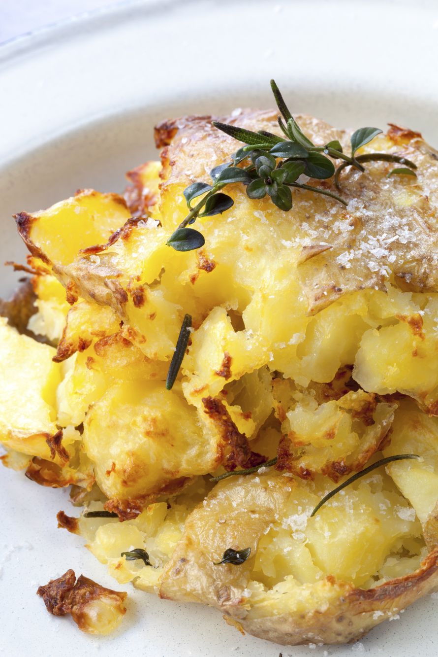 Keitä perunat kuorineen tai käytä ylijääneitä keitettyjä perunoita. Voitele laakea uunivuoka öljyllä. Asettele perunat vuokaan ja murskaa varovasti lättänöiksi perunansurvimella (tai puhtaalla viinipullolla tai jopa nyrkillä, jos aggressioiden purkaminen tuntuu hyvältä ajatukselta). Murskauksen tulee rikkoa perunan pinta ja litistää se, mutta potun tulisi pysyä kuitenkin yhdessä osassa.