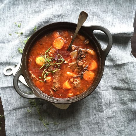 Tätä pataa haudutetaan uunissa ainakin 1,5 tuntia, joten sillä aikaa ehtii vetäistä pidemmänkin hiihtolenkin. Lisää lämpöä tuo curry. Jos teet oikein ison satsin, riittää ruokaa pariksikin päiväksi, sillä padathan tunnetusti vaan paranevat yön yli maukustuttuaan.