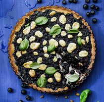 Basilika-mustikkapiirakan juju on basilikasokeri, jota löytyy piiraan pohjasta ja ripaus myös mustikoiden päältä.