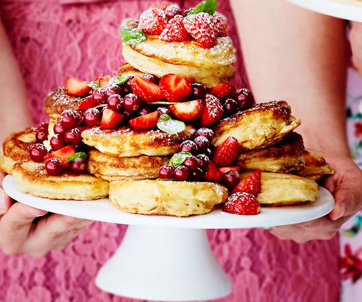 Amerikkalaiset pannukakut ovat monen suosikkiruoka brunssilla. Ne ovat ihania sellaisenaan, vaahterasiirappilorauksen ja muutaman marjan kera, mutta voit helposti tarjota pannarit astetta näyttävämmin: kokoa niistä tornimainen pannarikakku! Ripottele päälle runsaasti kauden tuoreita marjoja ja tupsauta koristeeksi hieman tomusokeria.