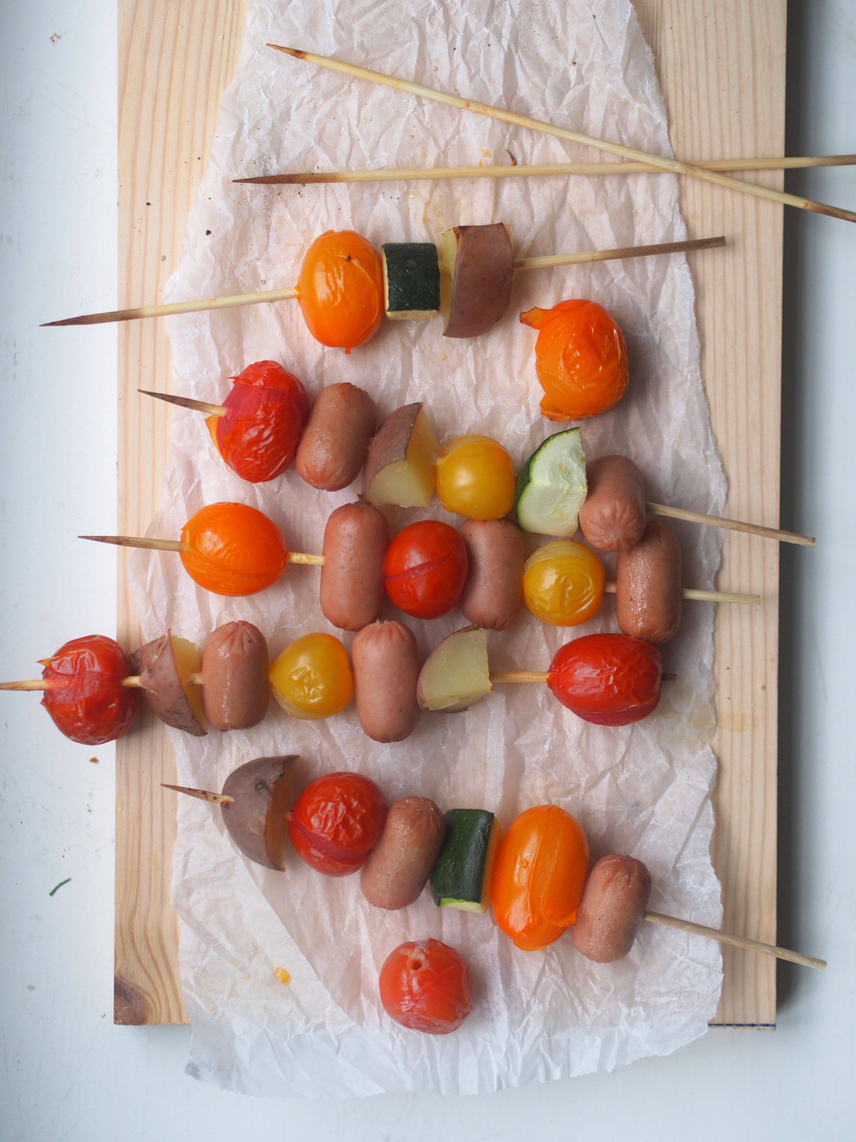 Tarvitset: Prinssinakkeja, keitettyä perunaa, erivärisiä kirsikkatomaatteja, kesäkurpitsaa ja halutessasi muita herkkuja. Lisäksi tarvitset varrastikkuja.