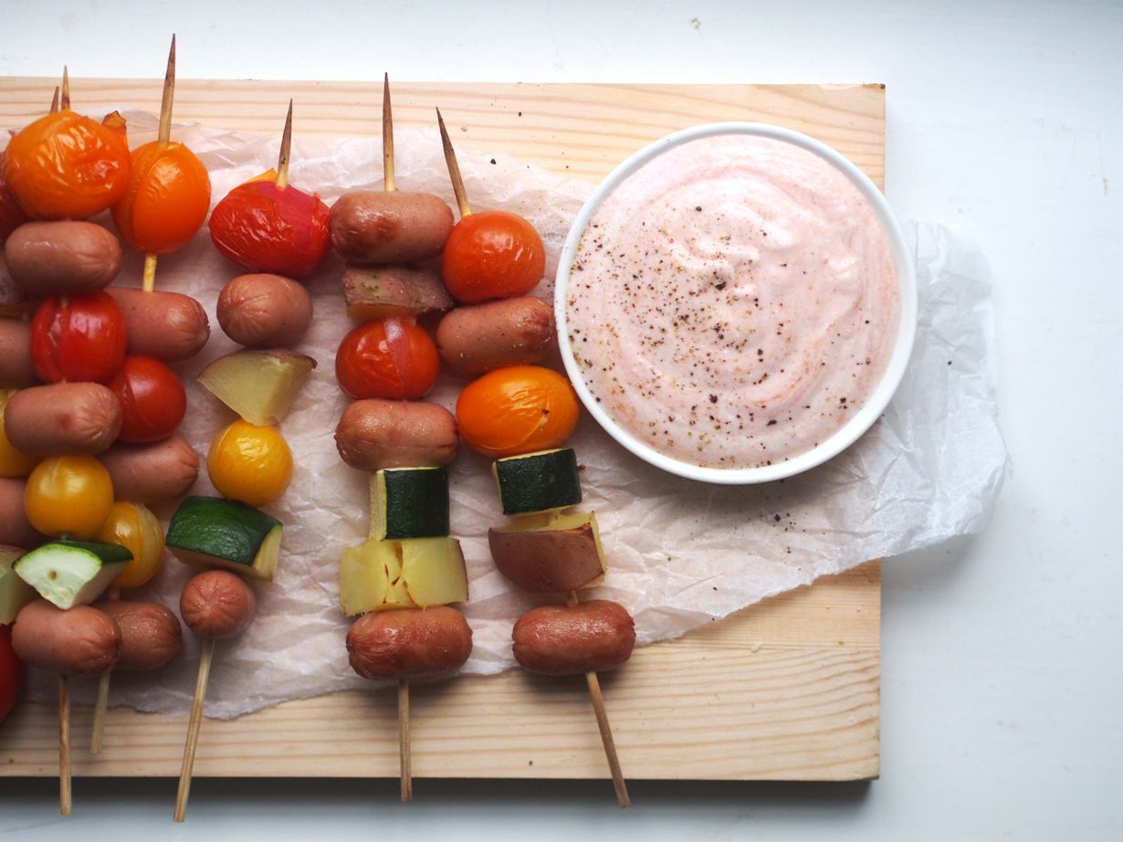 Pilko perunat ja kesäkurpitsat isoiksi lohkoiksi niin, että ne vastaavat kooltaan kirsikkatomaatteja. Lado varrastikut täyteen herkkuja haluamassasi järjestyksessä.