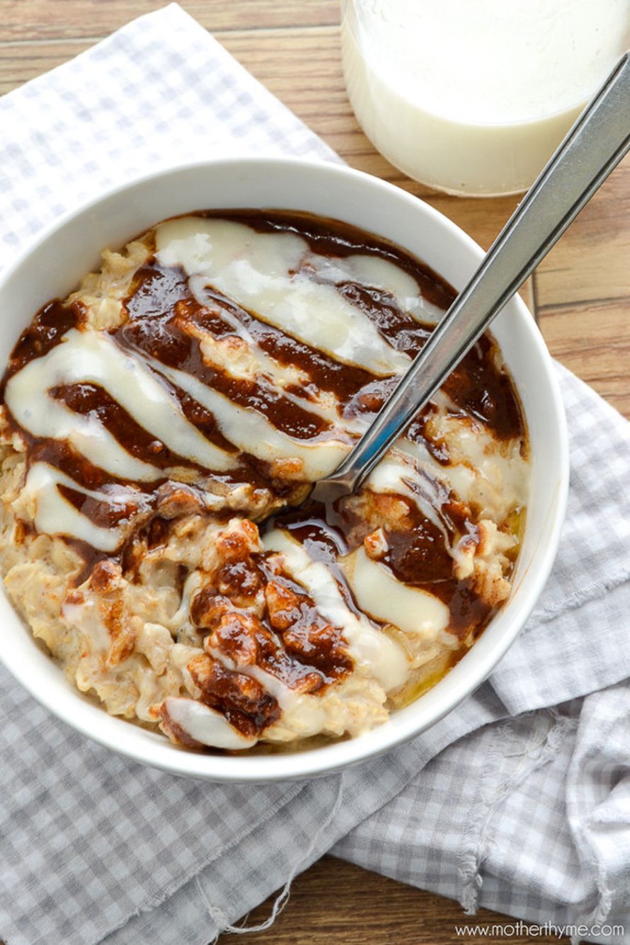 MotherThymen amerikkalainen korvapuustipuuro on jo itsessään aavistuksen makea: kaurahiutaleiden sekaan tulee vaniljaa ja ruskeaa sokeria. Tärkein on kuitenkin puuron kermainen kuorrutus, johon sulatetaan tuorejuustoa. Se tuo makean rinnalle aavistuksen hapokkuutta.
