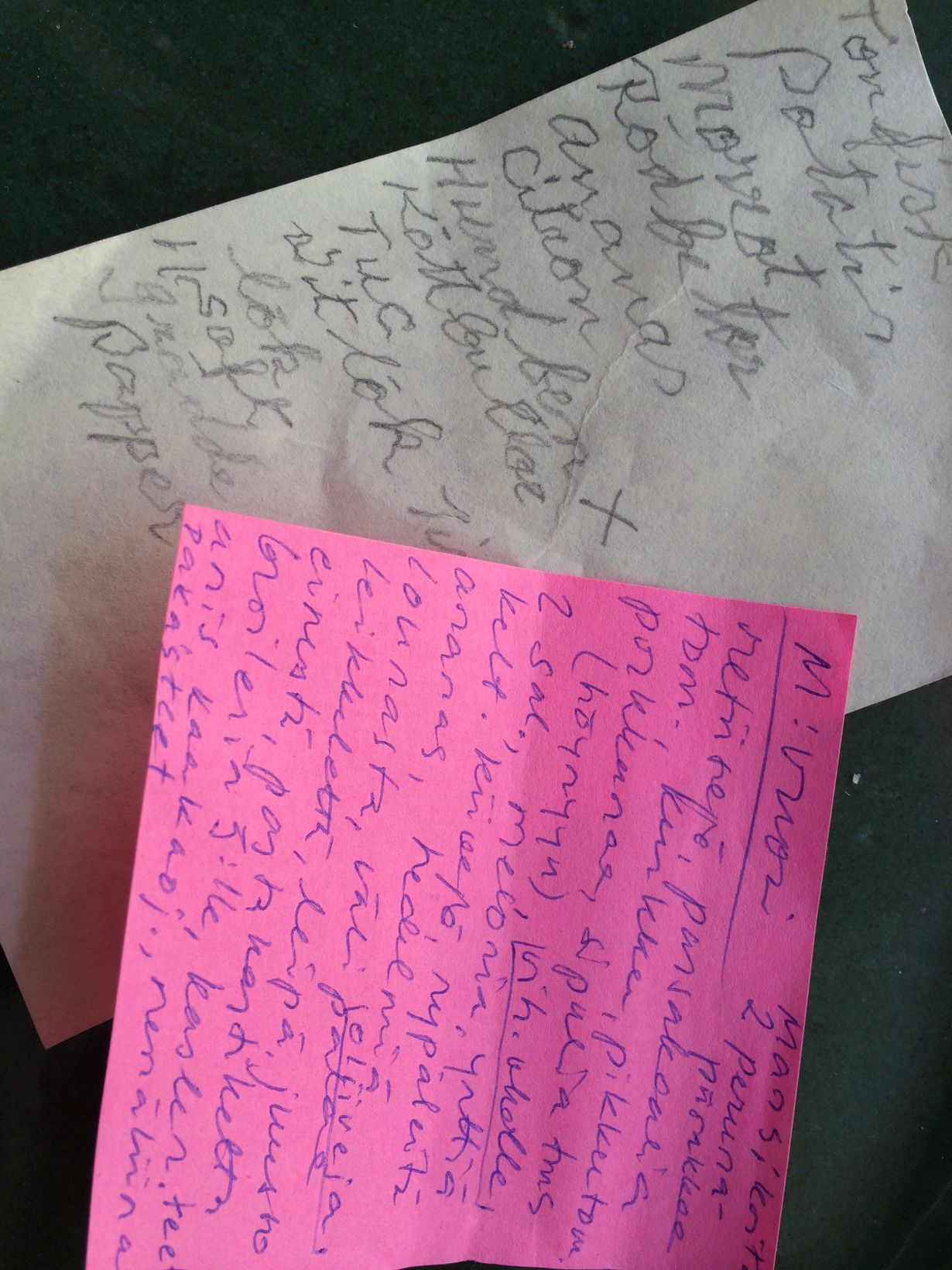 Soppa365 liittyi tänään maanantaina kauppalappujen metsästäjien joukkoon. Läheisestä ruokakaupasta ostoskärryjen alta löytyi pinkki post-it-lappu, jolle oli kirjoitettu kuulakärkikynällä 30 tuotteen ostoslista. Toinen kauppalappu löytyi lattialta kassojen vierestä. Sekin oli post-it-lappu, keltainen ja pinkkiä isompi. Sen 13 tuotteen lista oli kirjoitettu lyijykynällä ruotsiksi.
