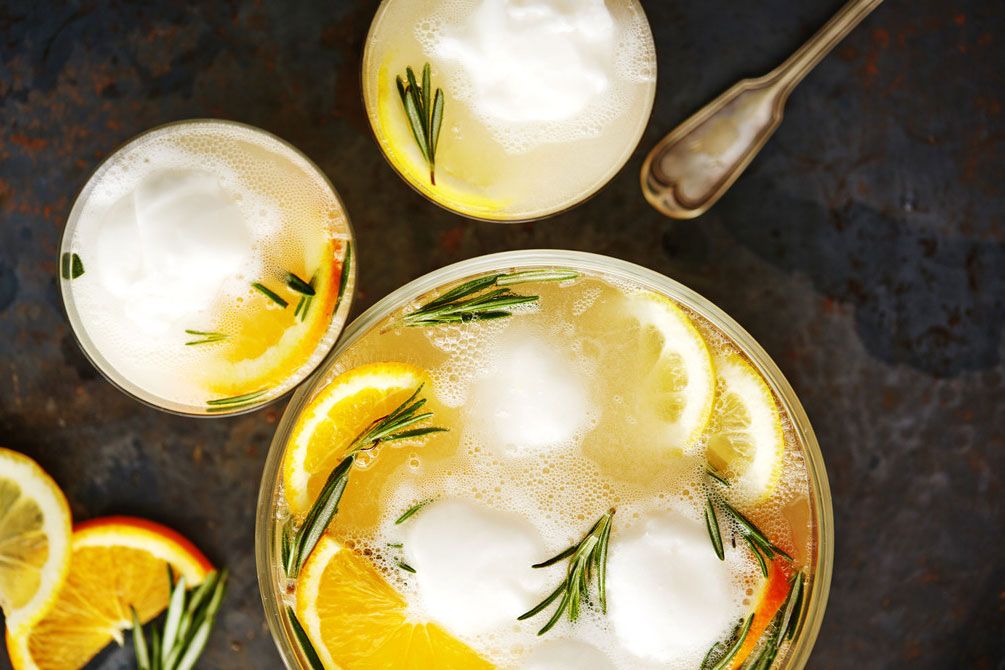 Sitruunasorbettibooli viilenee sorbettipallojen ansiosta. Raikas juoma virkistää mukavasti aikuisten kesäillan viettoa.