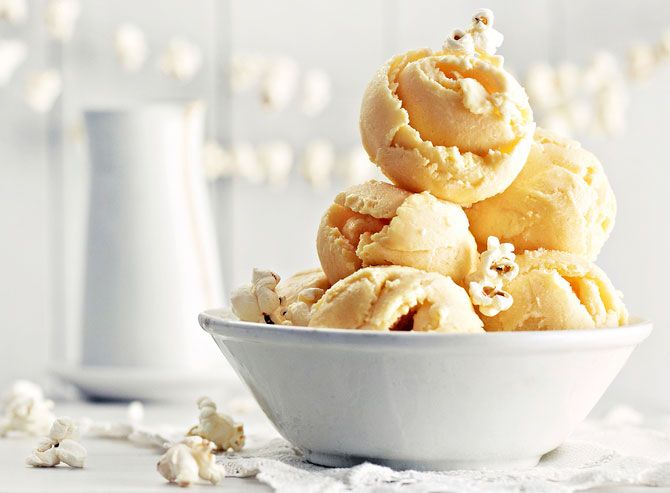 Aavistuksen suolainen popcornjäätelö onnistuu myös ilman jäätelökonetta! Tarjoile poppareiden, suolapähkinöiden ja kinuskin kanssa.