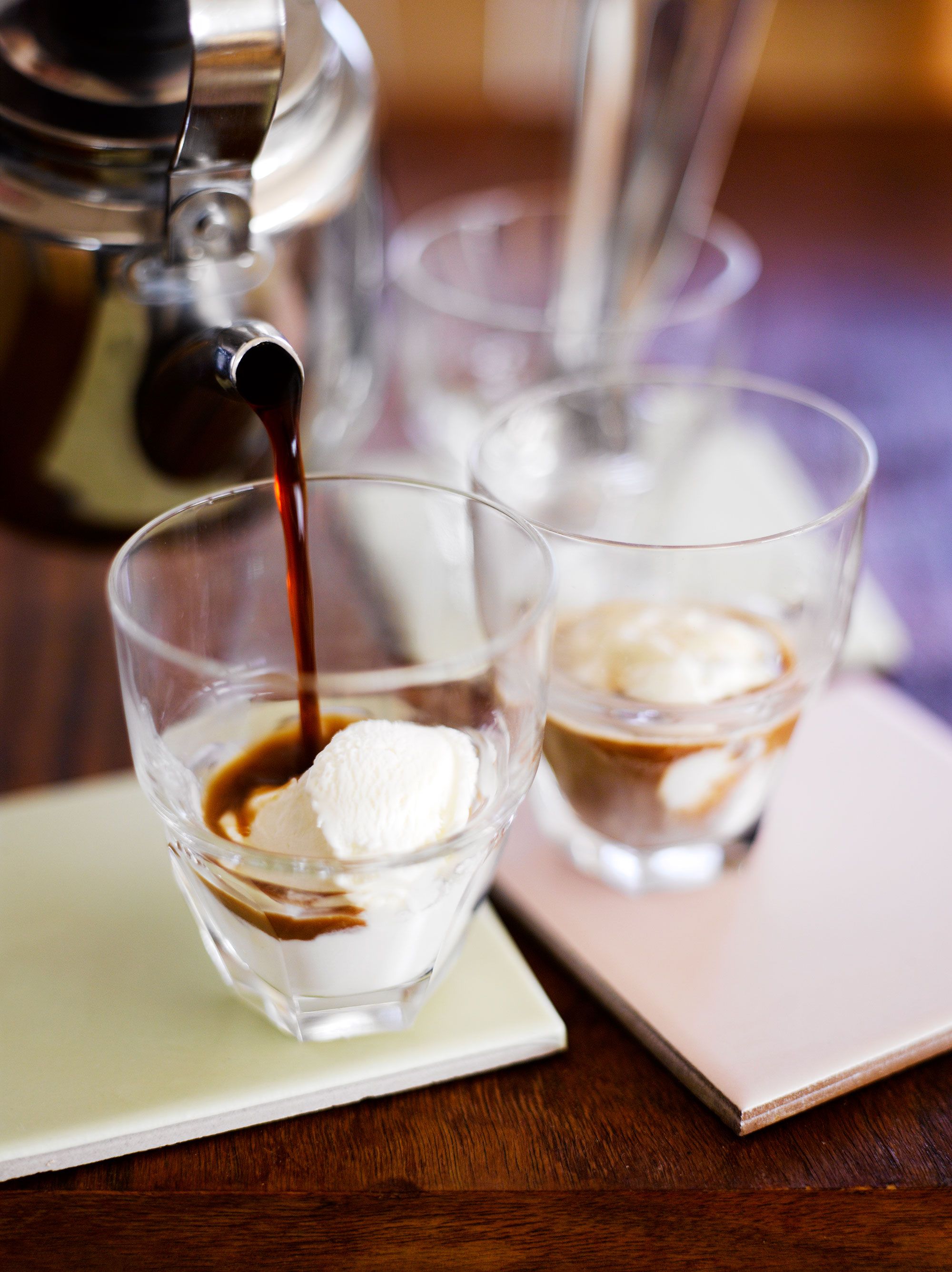 Kesäinen jälkiruokakahvi tehdään asettamalla pieni jäätelöpallo kupin pohjalle ja kaatamalla sumppia päälle. Jätski viilentää kahvin siemailulämpötilaan pikaisesti. Erityisen trendikkään jääkahvin saat aikaan, kun valmistat satsin kylmäuutettua kahvia (ohjeen saat tästä) ja kahvijääpaloja, ja viimeistelet juoman jäätelöpallolla. Maistuu mahtavalta myös blenderissä pirtelöksi ajettuna suklaakastikelorauksen kera.