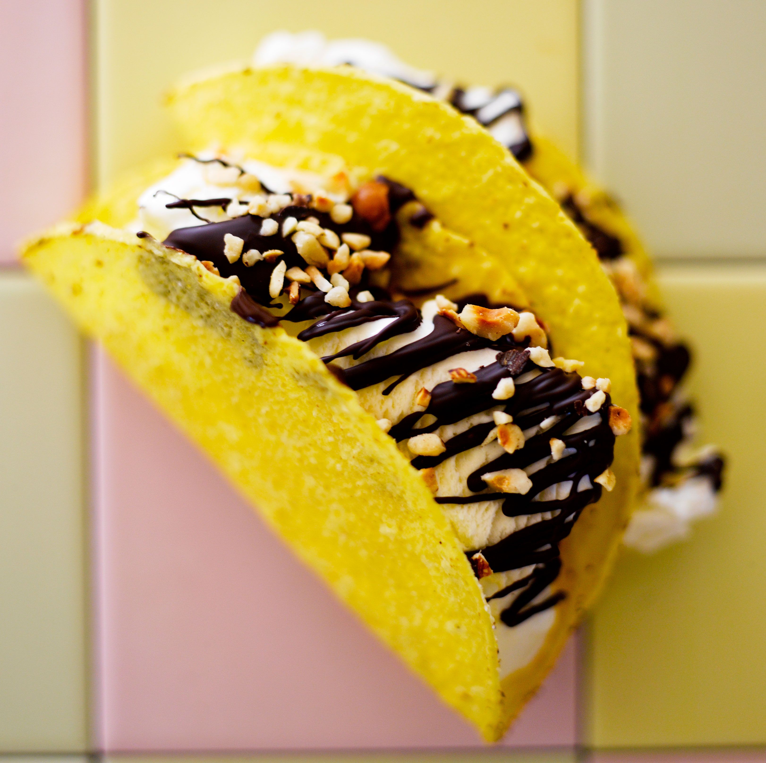 Jäätelöä ei tarvitse lokeroida vain makeaksi herkuksi, sillä esimerkiksi suolapähkinät maistuvat jäätelön kanssa mainiolta. Nykyisen Meksiko-trendin hengessä voit kokeilla myös jäätelötacoa. Täytä rapea tacokuori pehmenneellä jäätelöllä. Sulata tummaa suklaata ja valuta se kuorrutteeksi. (Oikaisija käyttää tietty valmiskastiketta tai nutellaa.) Sitten vielä manteli- tai suolapähkinärouhetta koristeeksi! Nosta taco pakastimeen jäätymään ennen tarjoilua. Viimeistele jäätynyt taco kinuskikastikkeella ennen kuin syöt sen.